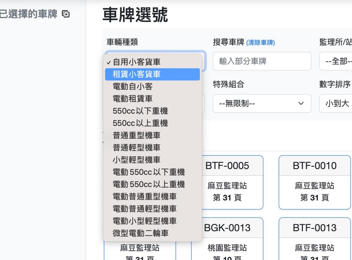 進入網站後,上方有很多條件可以設定,包括車輛種類、車牌、監理所/站,數字的開頭跟結尾,特殊組合以及排序方式,選了之後下方就會立刻顯示結果。