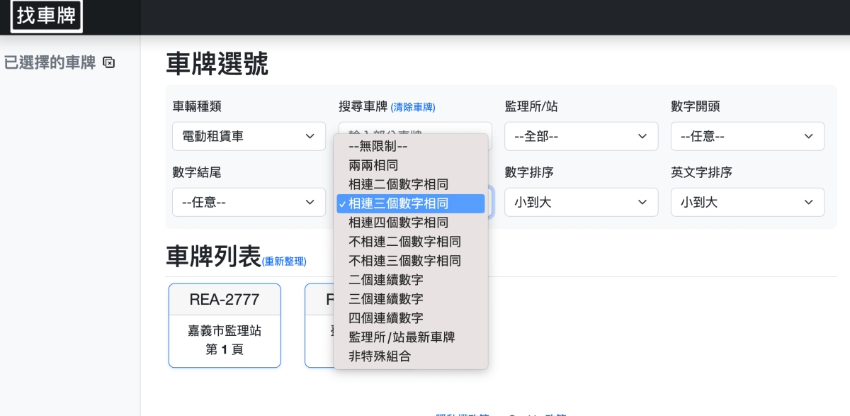 我蠻喜歡特殊組合這個條件篩選,可以篩兩兩相同,連續相同等各種常見的車牌號碼熱門組合。