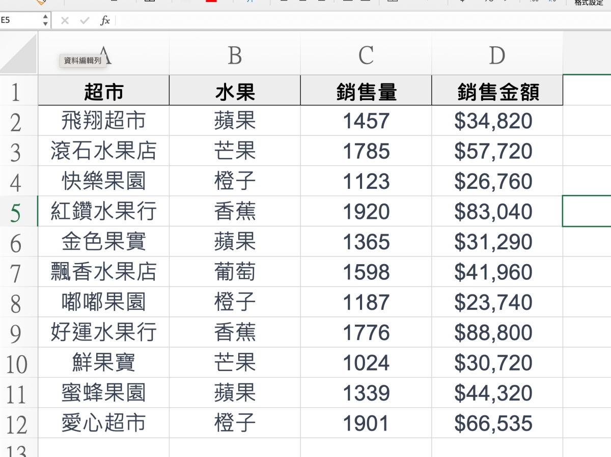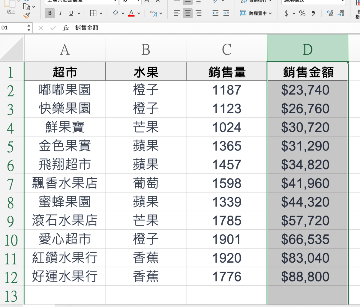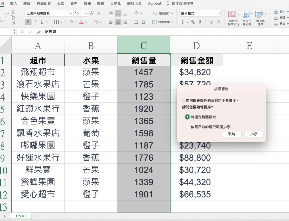 首先來看一下我們的內容有什麼,阿湯這邊做了一份簡單的範例,其中可以用來排序的主要有二個,一個是銷售量,另一個是銷售金額。