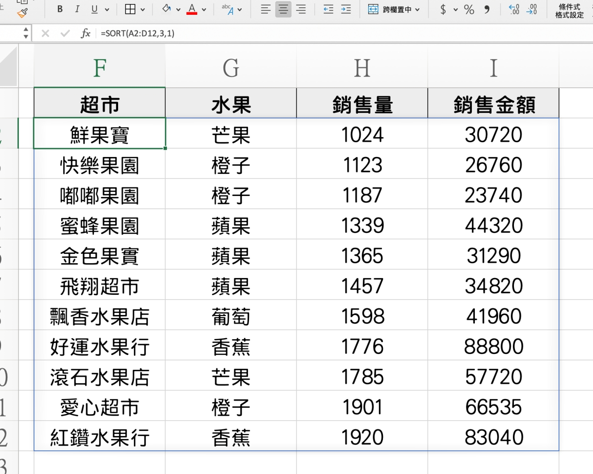 範圍大家應該沒有問題,第三個輸入 3 就是用銷量來排序,輸入 4 就是用銷售金額,而最後一個參數 1 就是小至大,-1 就是大至小,第四個參數不填的話預設是按照列排序,一般可以不填。