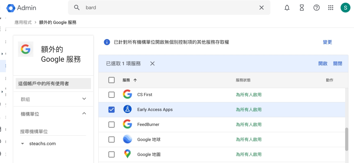 這提供給企業帳戶的人參考,只要將「Early Access Apps」這項功能開啟就可以了。(個人 Google 帳號請略過這個步驟)。