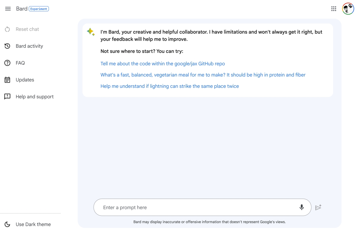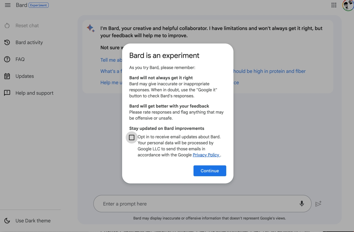 Bard 你可以看到,旁邊還有實驗功能的字樣,想試試的直接用 Google 帳號登入後就可以進到頁面開始試用。