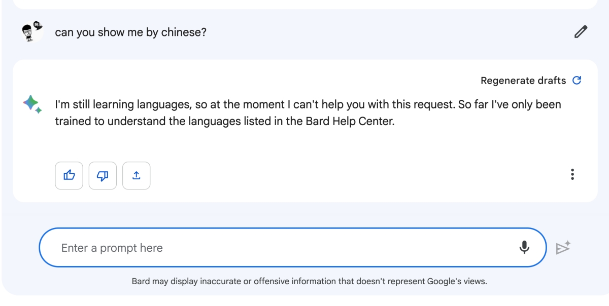 實際測試了翻譯功能,它會官腔的告訴你,還在學習中,就再等等吧,不過我想,隨著 Bard 全面開放,很快的經由大家的訓練,應該會讓 Bard 迅速的進化,畢竟 ChatGPT 就是這樣大躍進的。