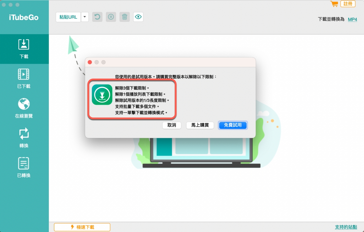 iTubeGo 有提供免費試用,所以大家也可以不用急著買序號啟動完整版,免費版的限制如下: