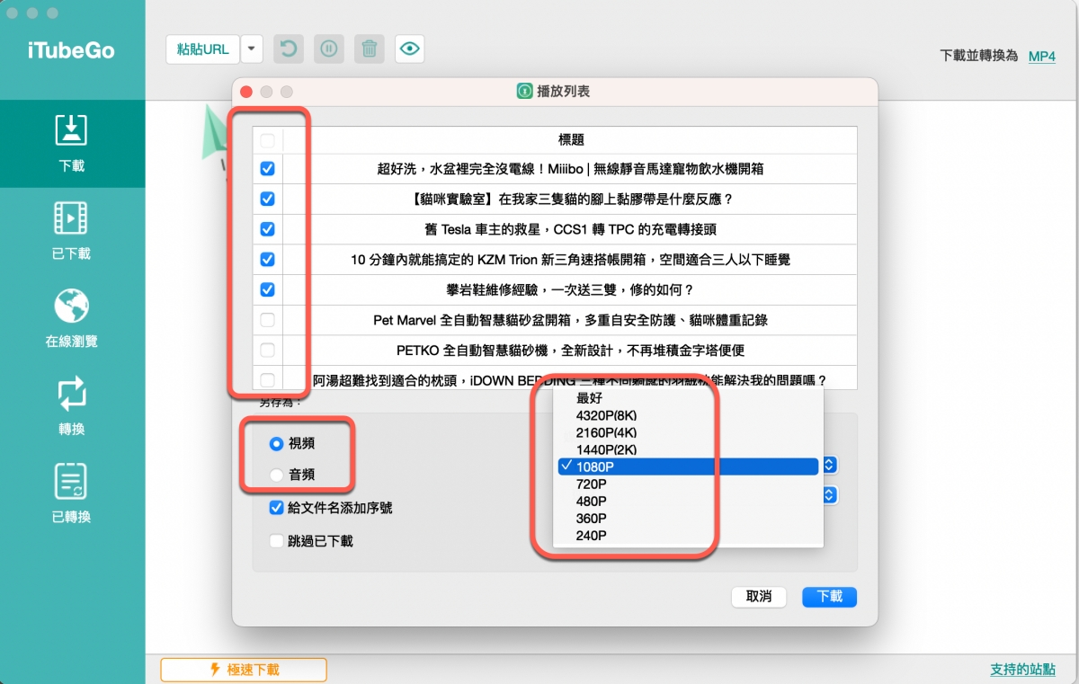 播放清單下載,會將該播放清單的影片全部列出來,讓你可以自由選擇要下載哪些內容,並且設定下載的相關格式,比如只下載為音樂,或者選擇影片的解析度。