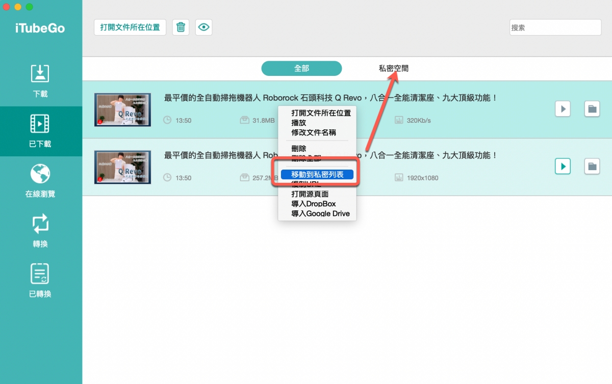 如果你下載的檔案有一些想要藏起來的,你也可以直接右鍵,將檔案移到私密空間。
