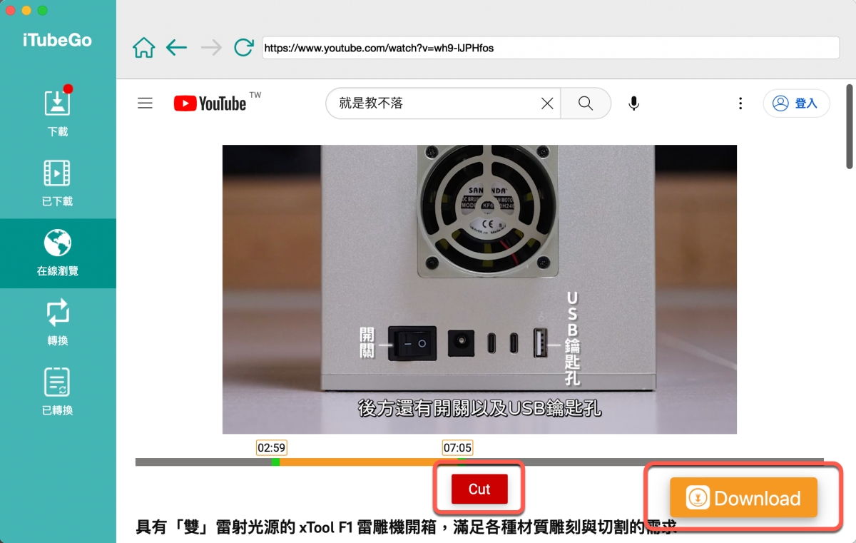 瀏覽時就像這樣,以 YouTube 為例,可以下載的話,下方就會直接出現 Download 可以按,又或是你也能直接調整要下載的片段區間再按下 Cut 進行下載,相當的方便,完全不用到其它瀏覽器複製再開軟體,在這裡面一次就搞定。