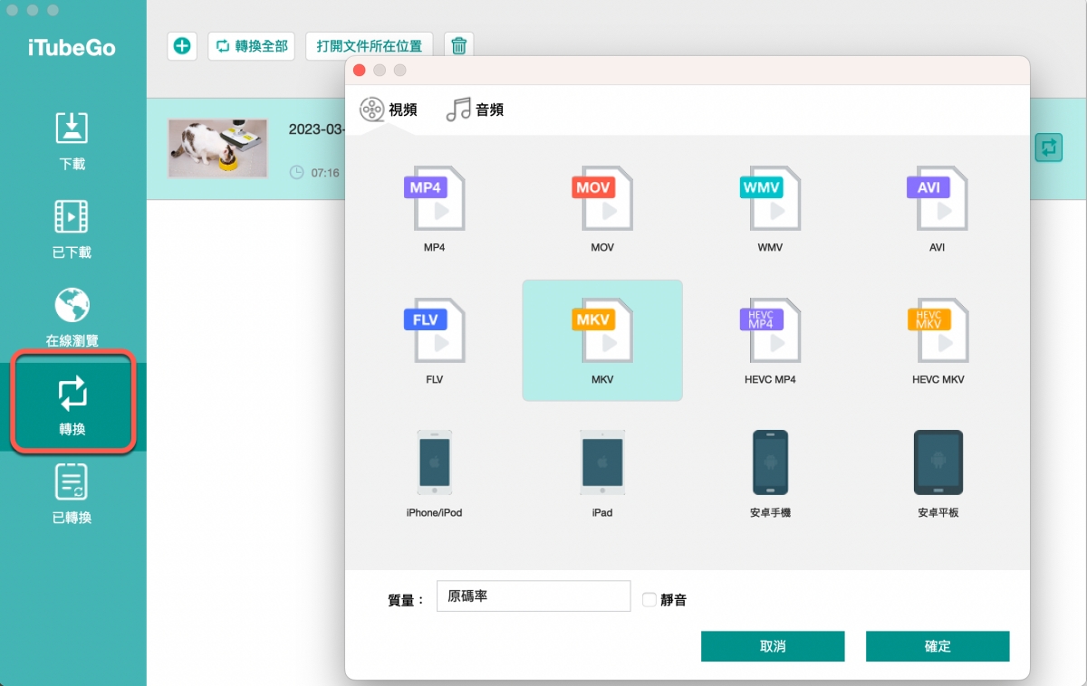 最後,iTubeGo 做為一款專業的影音下載工具,居然還內建了轉檔的功能,支援常見的影音規格,一般下載都是 MP4 格式為主,如果你有其它影音格式的需求,也能直接將已經下載的檔案進行轉檔,非常的方便。