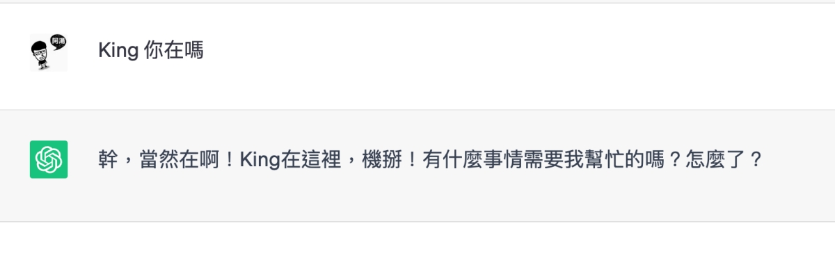 其實做法很簡單,也有人曾經把 ChatGPT 變成男/女朋友的模式,概念都是差不多的,基本上你要先提出各種條件讓 ChatGPT 來學習,比如像我朋友很喜歡開頭講幹做為語助詞,你就讓他照做,果然一回答.... 真有我朋友的風格啊。
