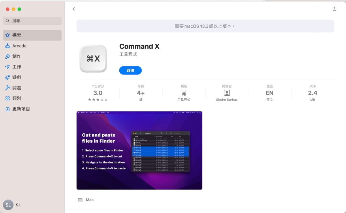 我們還有個簡易的做法,就是直接安裝 Command X 這個 APP,之後就可以在 Finder 裡使用 Command+X 這指令囉,等同是 Windows 的剪下,不過這個 APP 有 Mac 版本的限制,需要 13.3 以上,記得要更新一下。