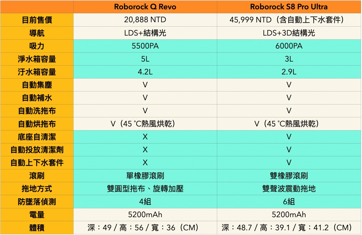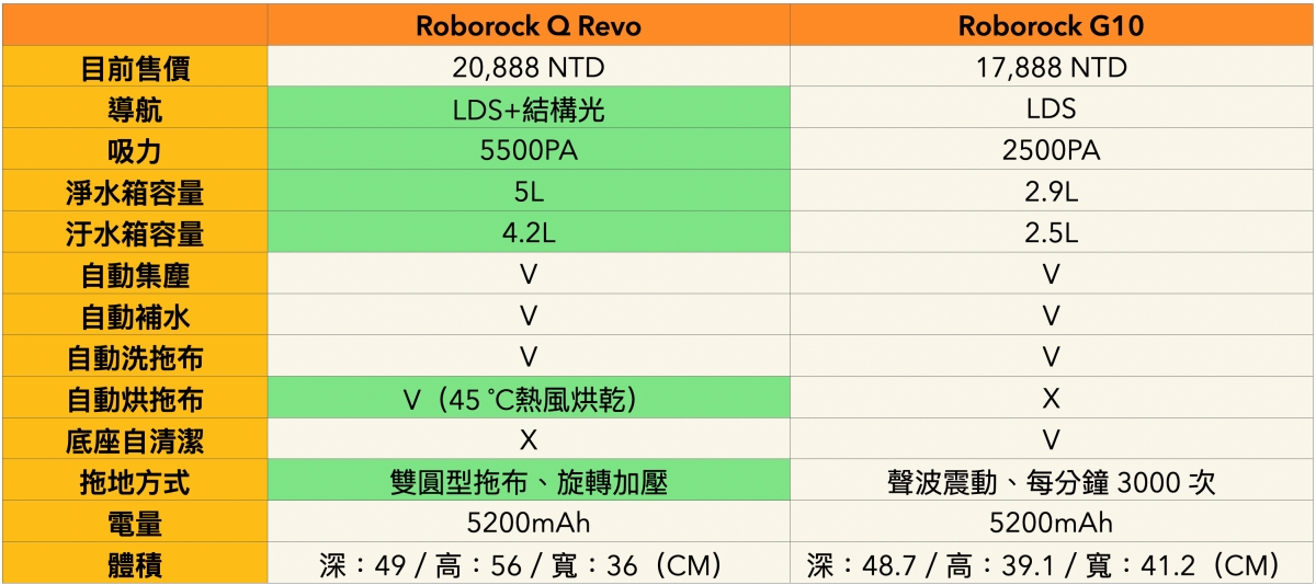 我們直接來看下表,也先說明一下,我們不把 Q Revo、G10 與 S8 Pro Ultra 做比較,因為不論是價格、功能,完全在不同等級上,原則上只要預算足夠,完全不會叫你比較,直接上 S8 Pro Ultra 就好,有錢就當個任性的小孩。