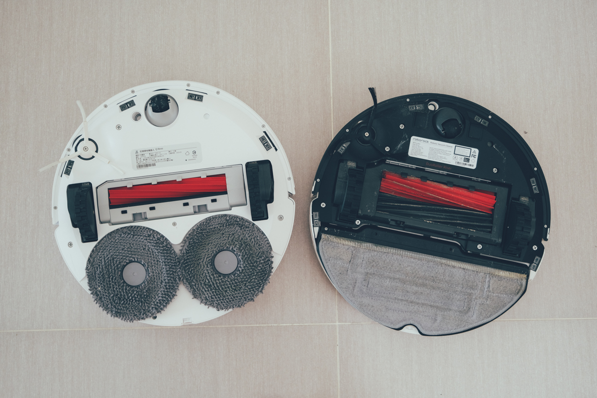 拖布的部份二者各有不同,清潔能力來說,我覺得二者差異不大,Q Revo(左)是透過雙圓型拖布旋轉以及 500g 的加壓進行拖地、而 S8 Pro Ultra 則是半月型拖布,並且採用雙聲波四區震動技術以及 600g 的加壓進行拖地,其實就日常清潔來說,二者我試下來差異不大。