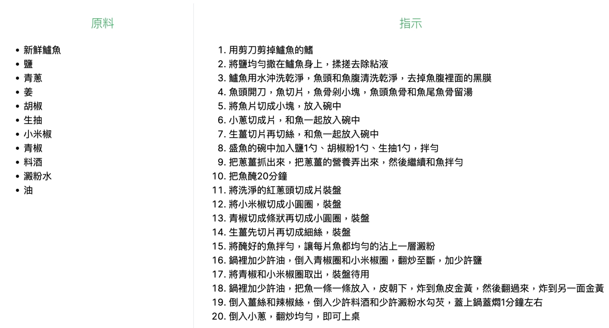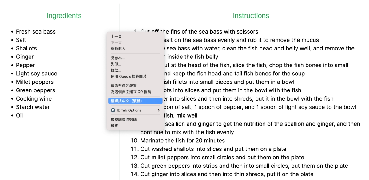 這樣就列出了食材跟步驟了,下方左邊是食材,雖然都英文,但其實只要用瀏覽器的功能,右鍵把網頁翻譯成中文就好。