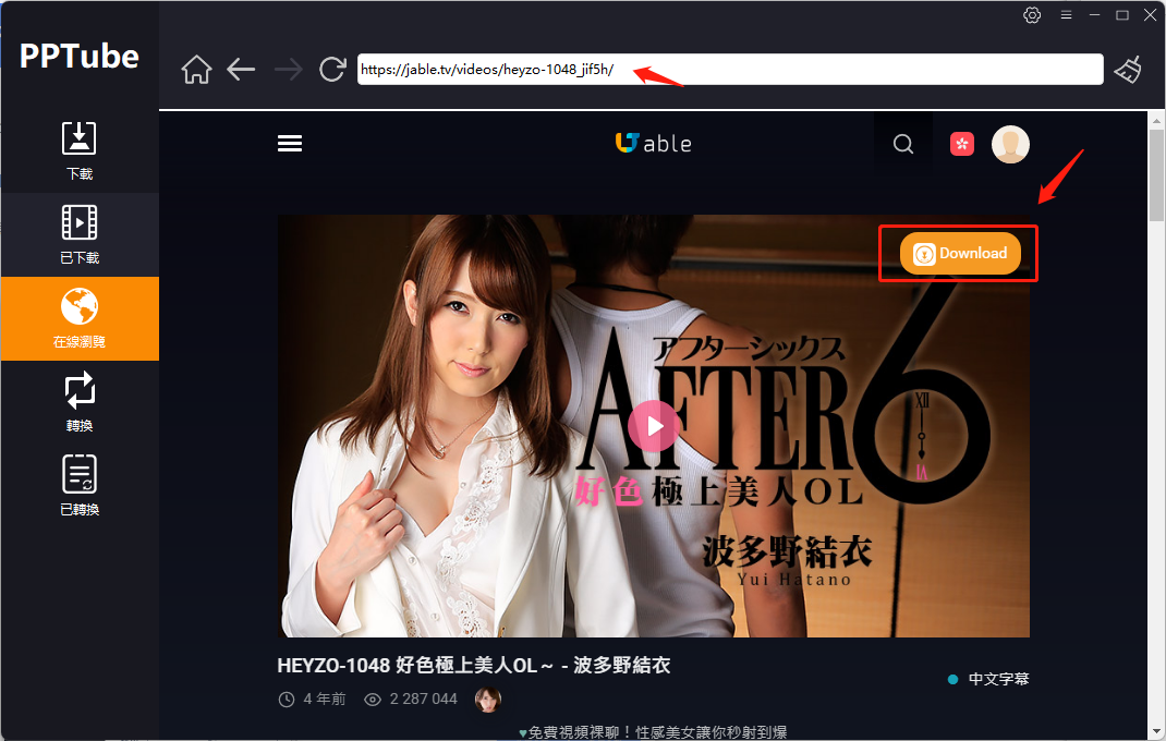 第三步:找到你要下載的Jable爽片,點擊PPTube的浮動按鈕“Download”即可自動解析下載。