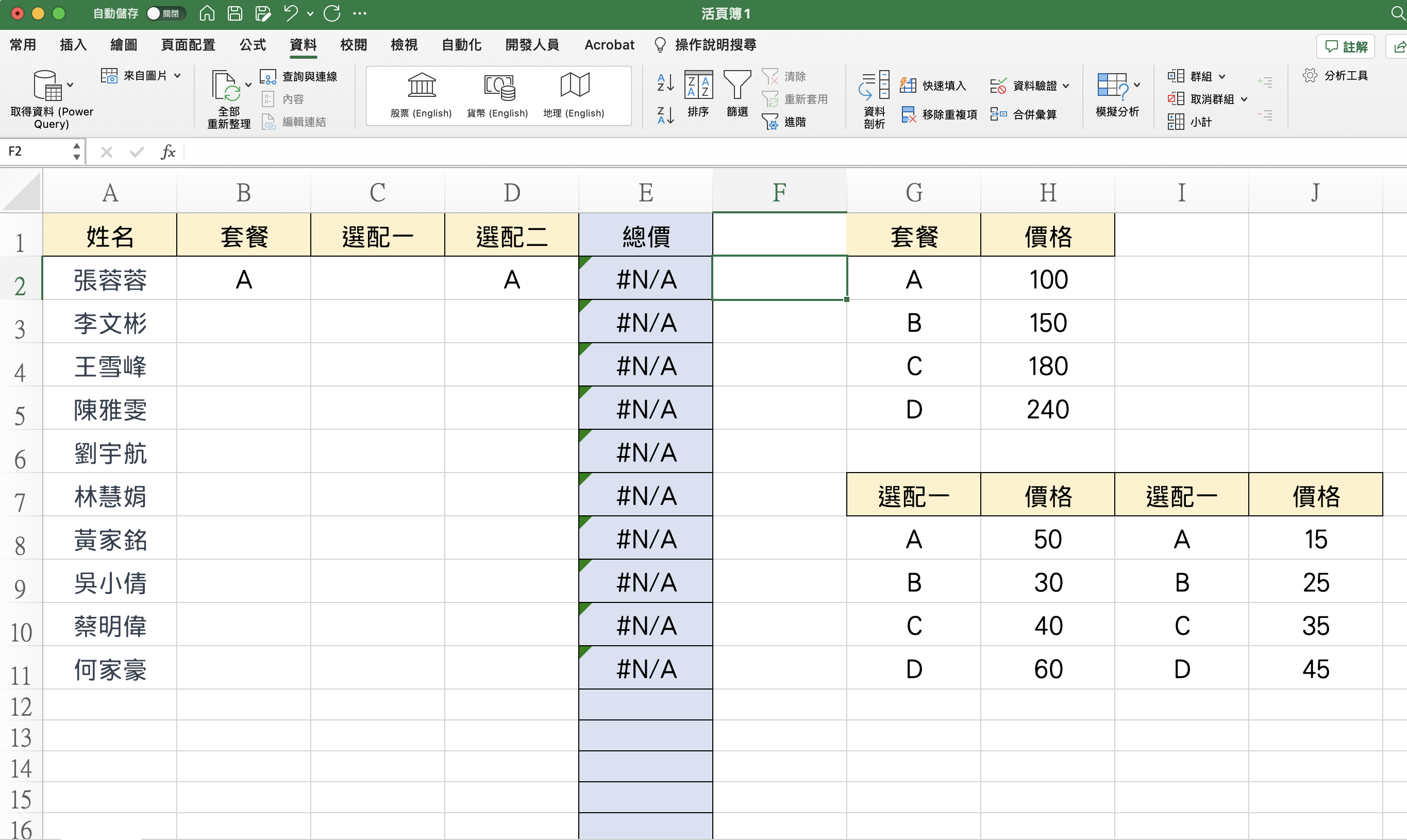 首先,我們想要做的表格像這樣,可能中午點餐時,大概會有像麥當勞或有不同餐點,這時可以做個表來快速解決統計每個人總價的問題,這邊我們用 VLOOKUP 來做,往下來看。