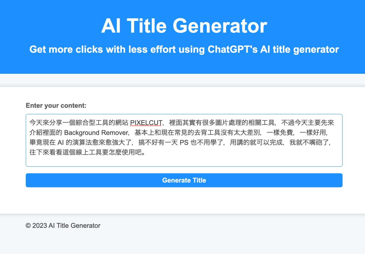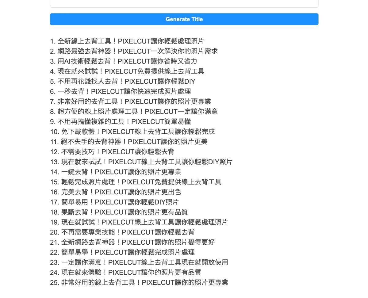 網站:https://ai-title-generator.onrender.com/進入網站後,直接把文章的內容貼到裡面,然後按下產生,貼進去的內容愈多愈好,這樣分析會愈準確。