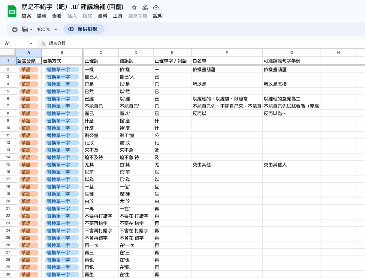 的介紹,「就是不錯字(吧)」是由 justfont 團隊製作的開源繁體中文字型,其獨特之處在於利用 OpenType 技術,實現了輸入「常見錯字」即會自動改正的功能。這款字型基於芫荽/Iansui 字型改作,目的是為了協助所有被生活中各式錯字所困擾的朋友。只要在支援 OpenType 的設計或文書軟體中使用這款字型,輸入常見的錯別字詞,系統將會主動替換為正確用字。例如,「在次」會被替換為「再次」,「因該」會被替換為「應該」等,對於常常打錯的朋友可以試試換成這個字型。