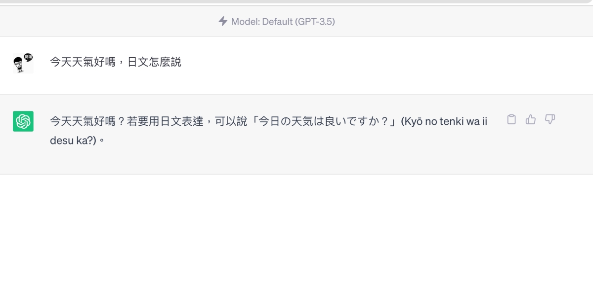 先給大家看一下,平常如果我們用 GPT3.5 版本來問的話,回答會像這樣,基本上跟翻譯軟體差不多,就是給你一次性翻譯。