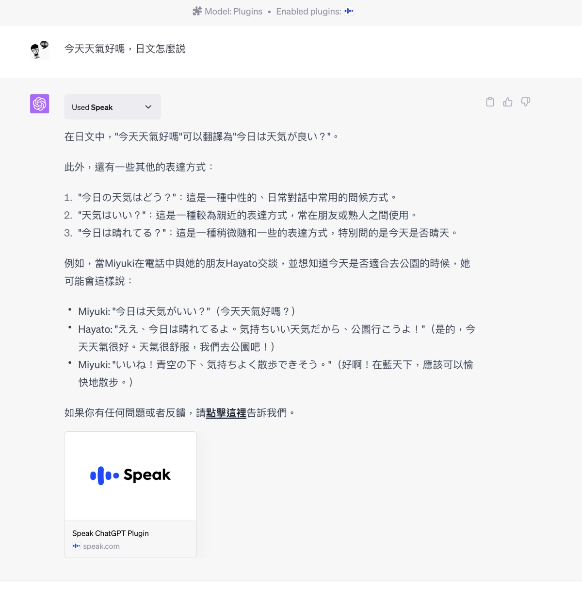 但當我們啟用了 Speak 插件後再來問一次,回答就變的超豐富,還會有實際範例可以參考,這對於學習語言才是更加有幫助的。
