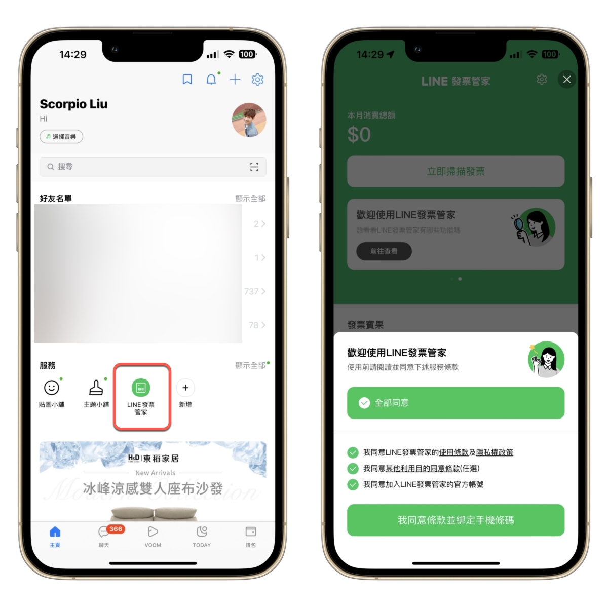 這個發票管家就藏在 LINE 首頁的服務裡面,你到你的 LINE 首頁,在服務那裡點擊 + 或是顯示全部,就可以在生活類別裡找到發票管家,然後把它加進去。
