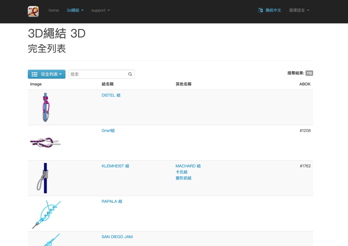 網站:https://knots3d.com/knots/zh_tw/ALL進入網站後,點擊上方的 3D 繩結,就可以查看全部繩結的列表。