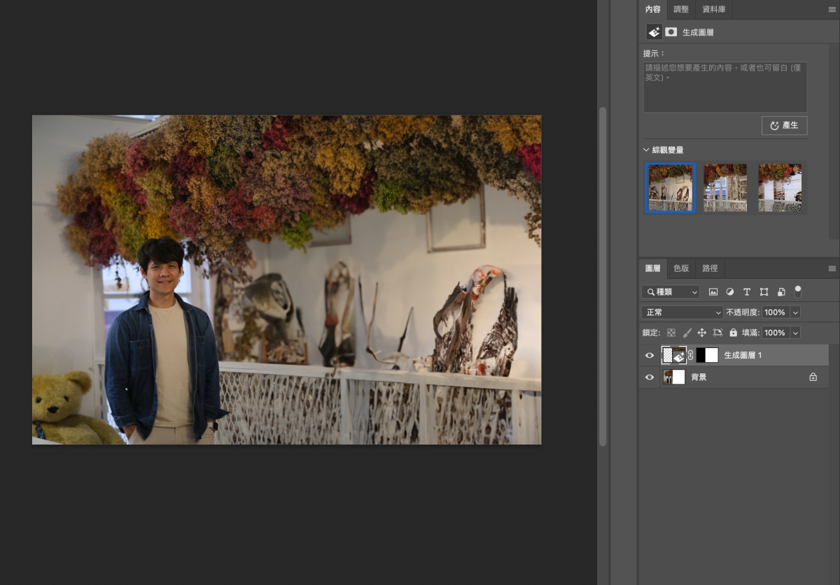 不過我覺得上面那種 AI 生成沒什麼,最厲害的是無中生有額外的空間,比如像這張,我把他往右延伸範圍後,選取起來按生成填色,然後什麼都不要填,直接按產生。