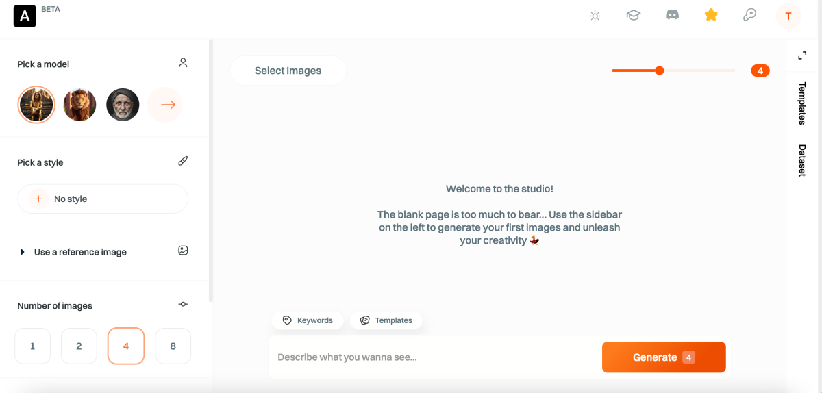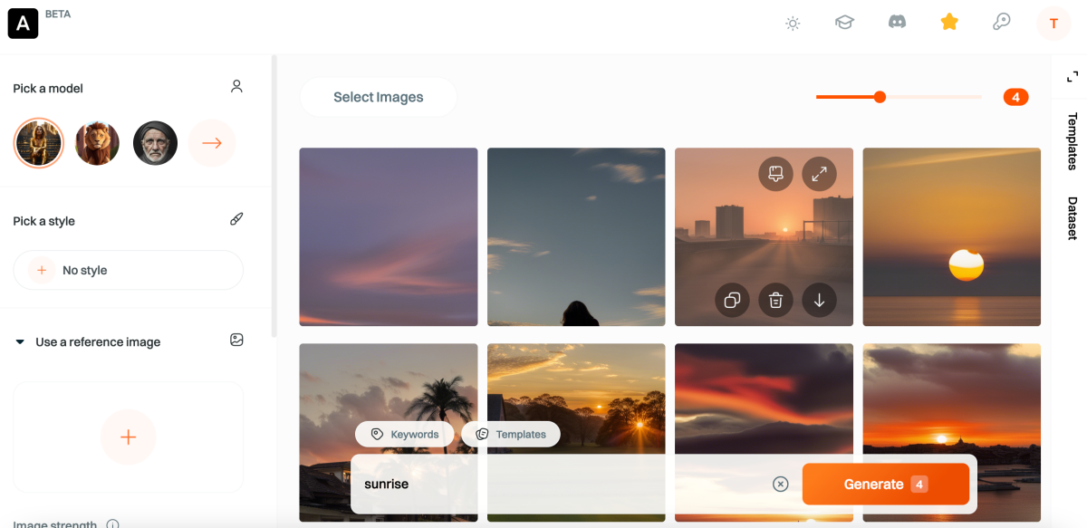 創作之前,左側有一些選項,像是有模組,風格可以選擇,也可以上傳對照用圖片,選擇每次產生多少組圖出來等等。