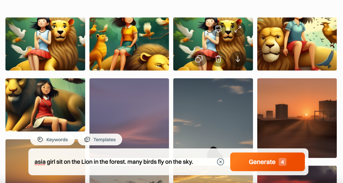 比較多的指令就像這樣,女孩坐在獅子上,有鳥在飛,基本上都幫我畫出來了,我想大概應該都知道怎麼使用了吧,去試試吧。