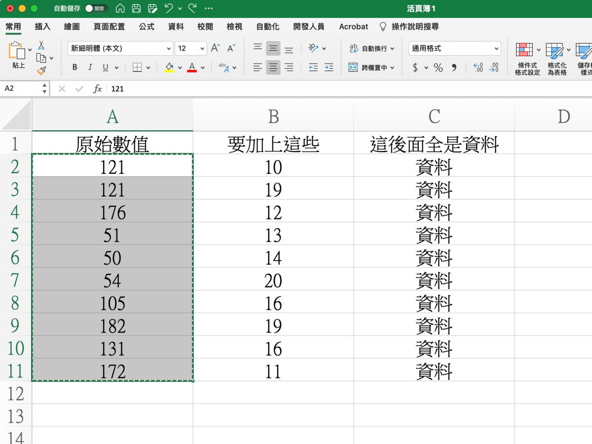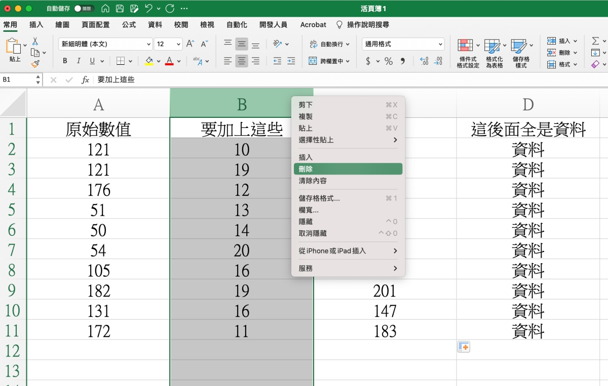 首先,大家會想到的方式,在 B 欄右邊插入一行後,將 AB 相加,獲得值後再把 B 刪掉,不過有個問題存在,因為他的資料很多,並不是 A 跟 B 欄都單純的只有這些資料,下方還有別的資料,因為不適合再插入輔助欄來做這些事。