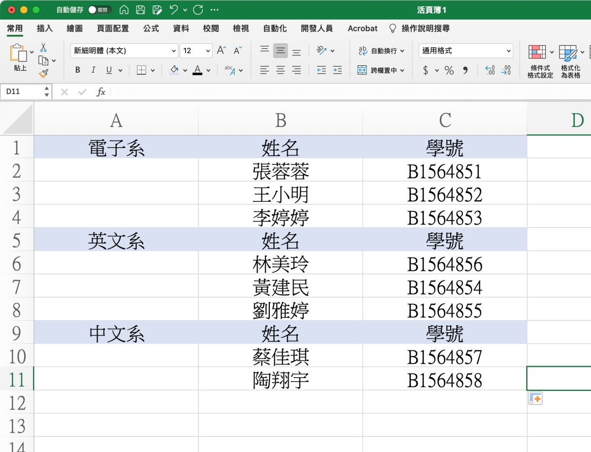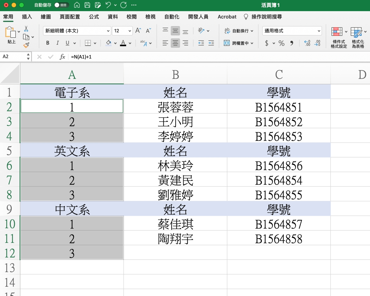 首先給大家看一下需求長怎樣,就像空白欄位一樣,我們要電子系下先填入 1.2.3 後,在英文系下一樣 1.2.3 這樣,每個類別都會從 1 開始填入。