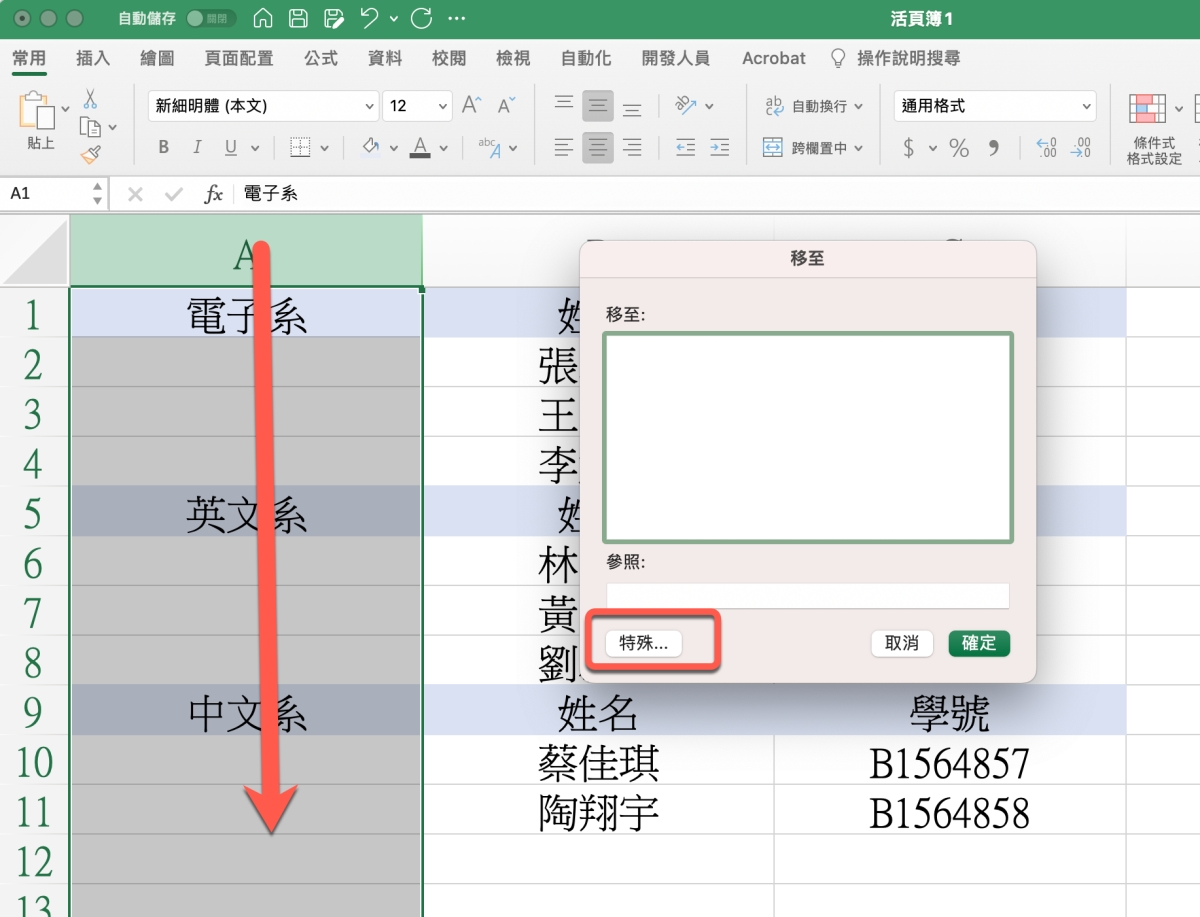 這時我們可以先選擇 A 列,你可以選整列也可以只選資料範圍,然後按下 Ctrl + G,進入「特殊」。