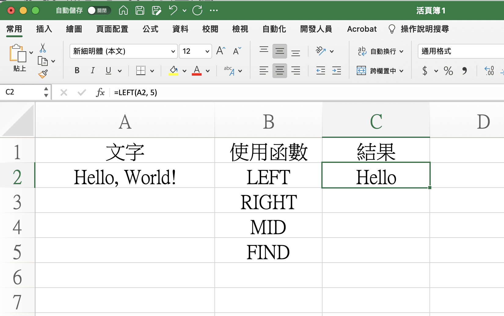 - 範例:=LEFT(A2, 5)會返回"Hello",代表是從 A2 欄位最左邊取回 5 個字元。
