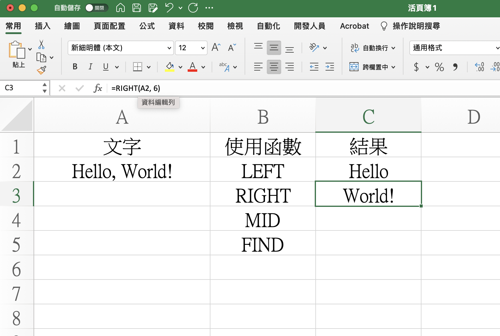 - 範例:=RIGHT(A2, 6)會返回"World!",代表從最右邊取回 6 個字元。