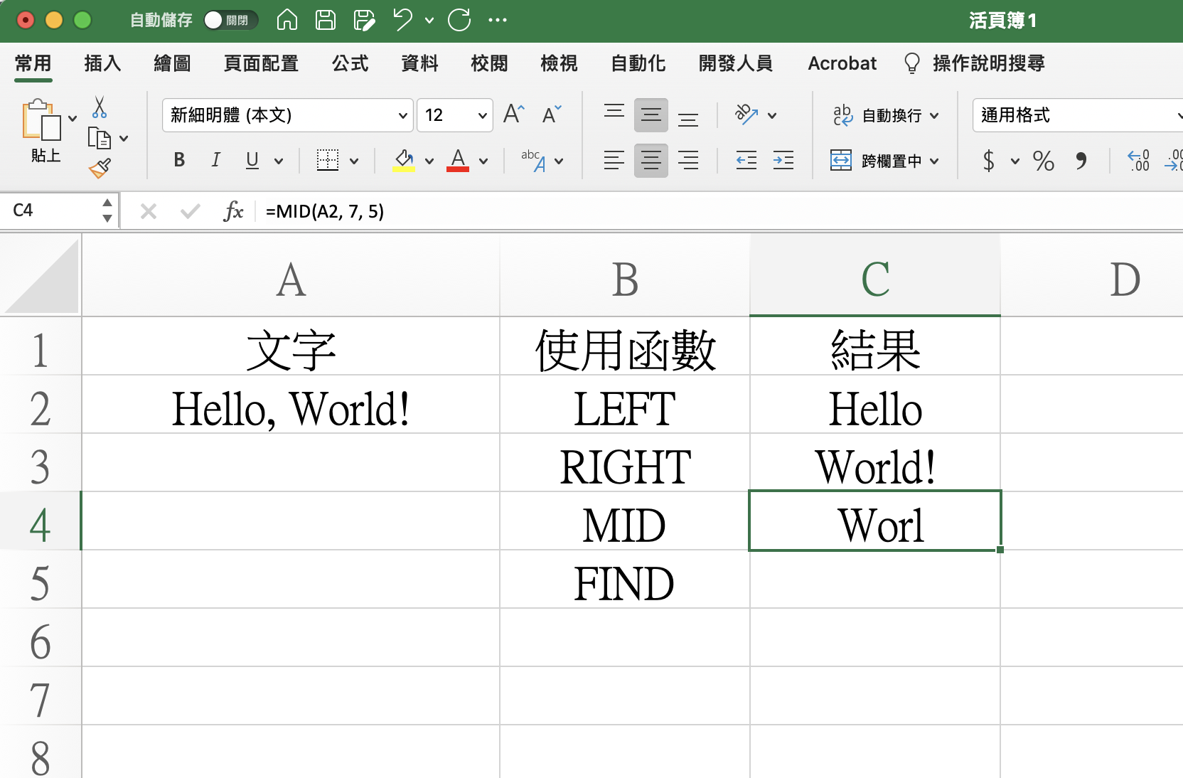 - 範例:=MID(A2, 7, 5)會返回"Worl",從第七個字元開始取回 5 個字元。