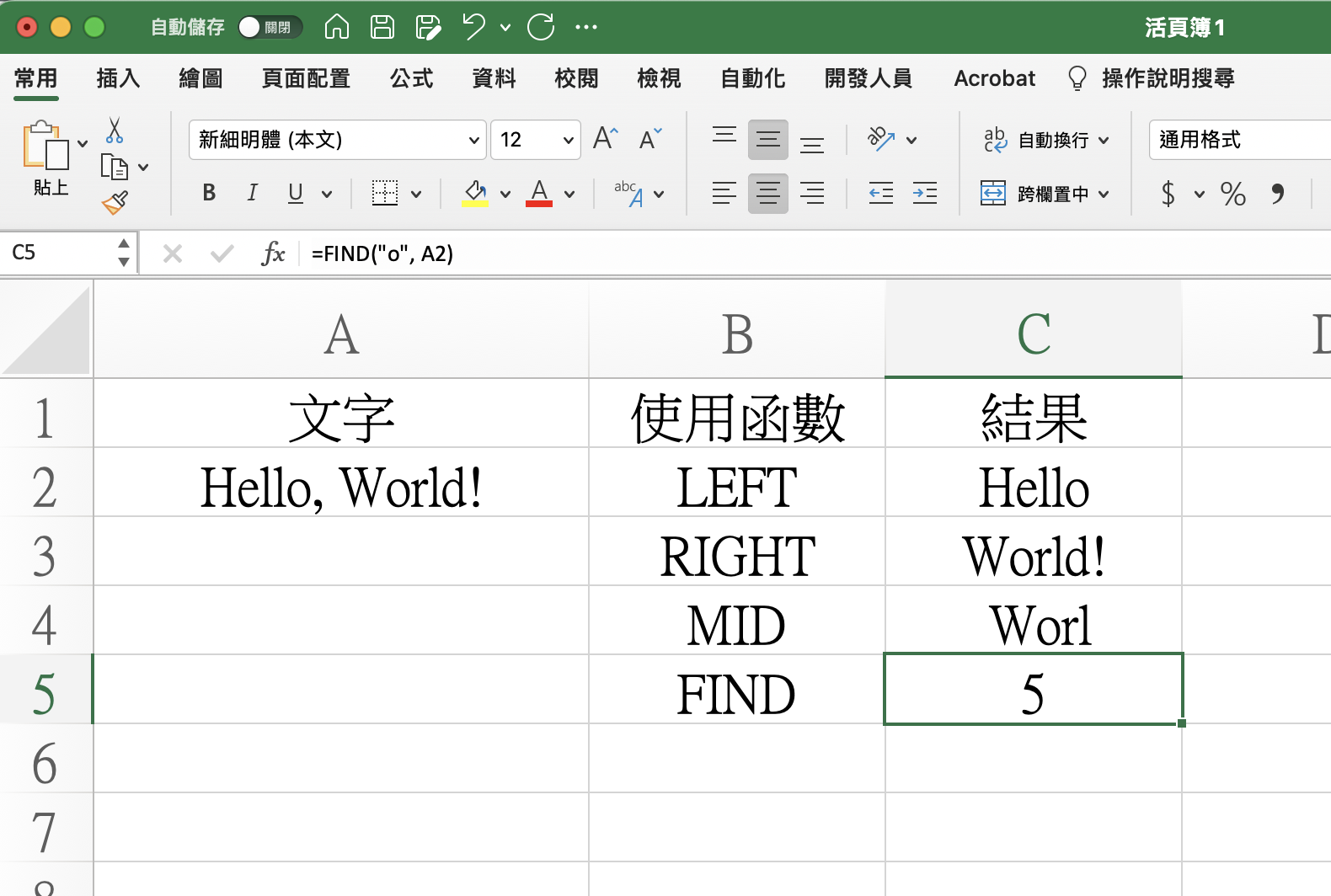 - 範例:=FIND("o", A2)會返回 5,因為在文字串中第一個字母'o'的位置是 5。