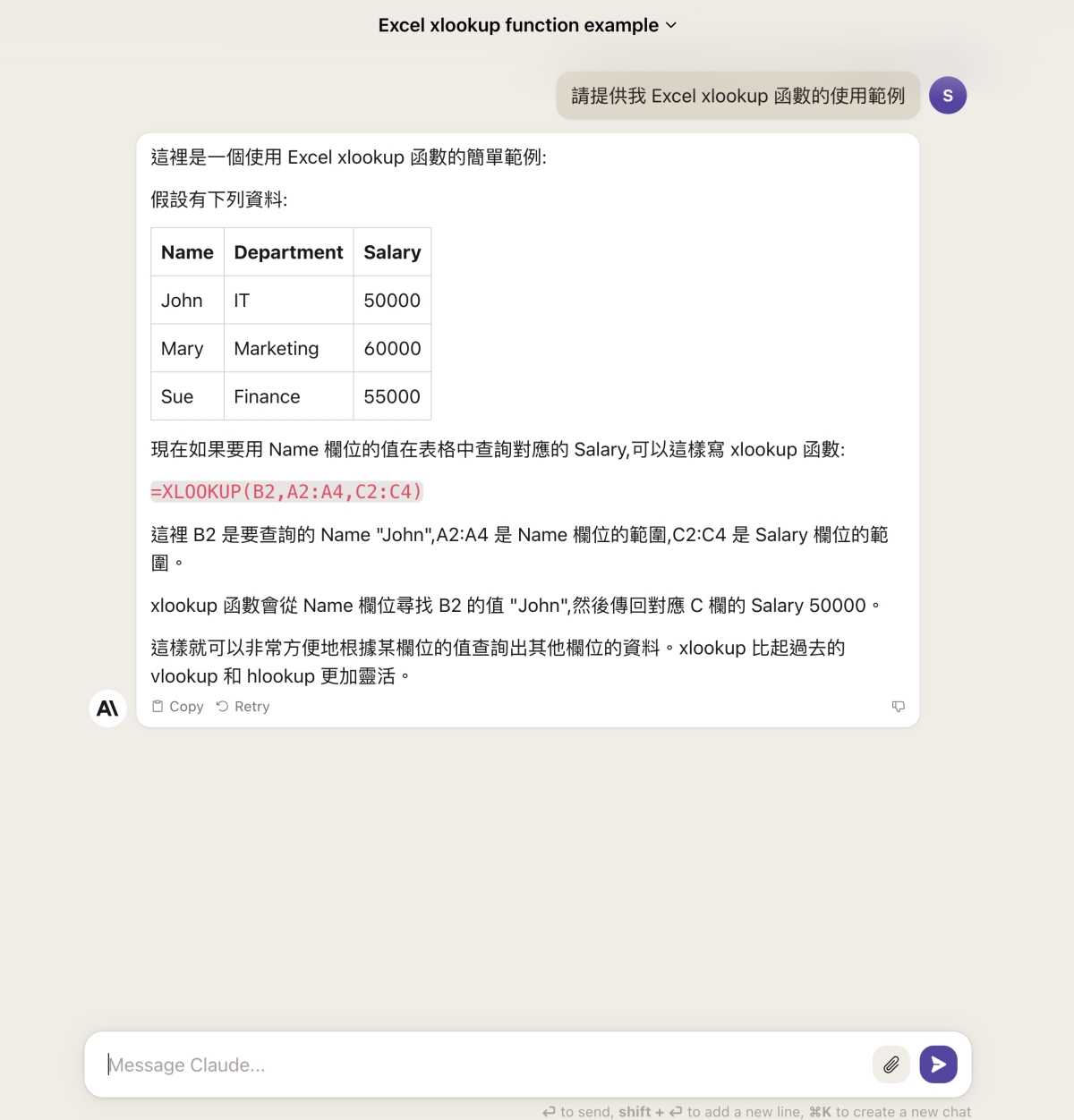 比如像我最常用的,直接問 Excel,而且不太需要跟他講用表格顯示,基本上直接就會以最佳的方式顯示,ChatGPT 有時都還得叫他用表格才會顯示為表格。