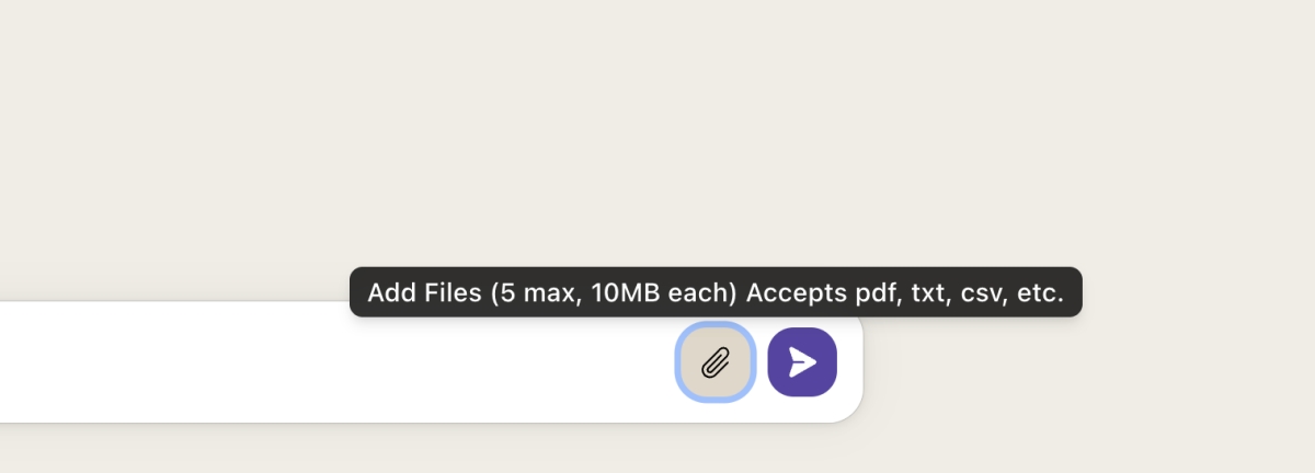 最多一次可以上傳 5 個檔案,每個檔案小於 10MB,支援 PDF,txt,csv 等檔案,我試過 Office 的檔案也沒有問題。