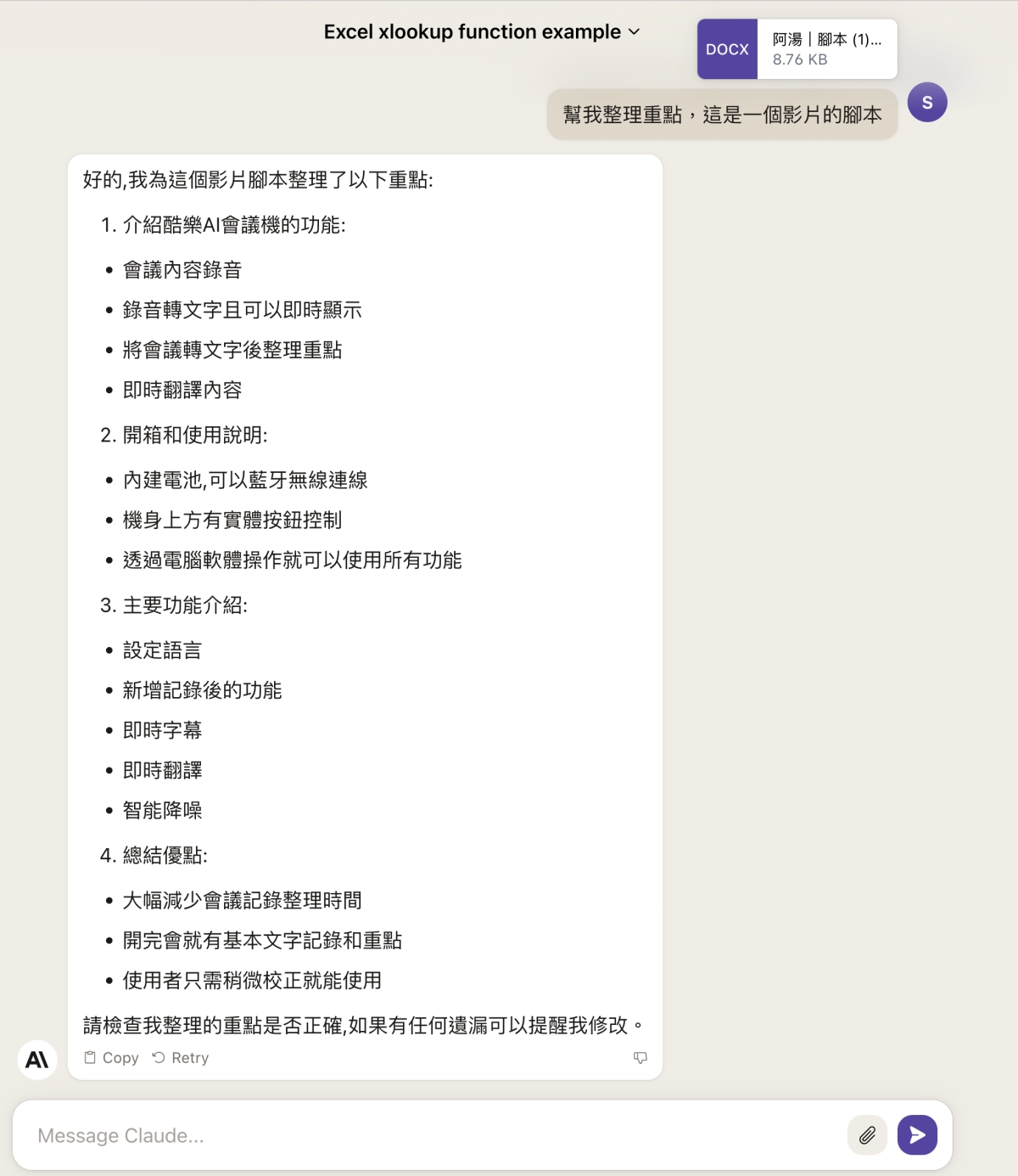 比如我有個腳本,想要整理一下摘要,丟上來,他就可以幫我直接分析,而且速度還蠻快的。