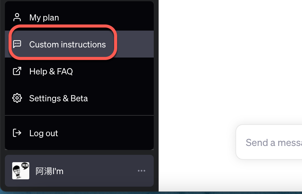 再回來按一次選單,在這裡就會多一個「Custom instructions」自訂指令。