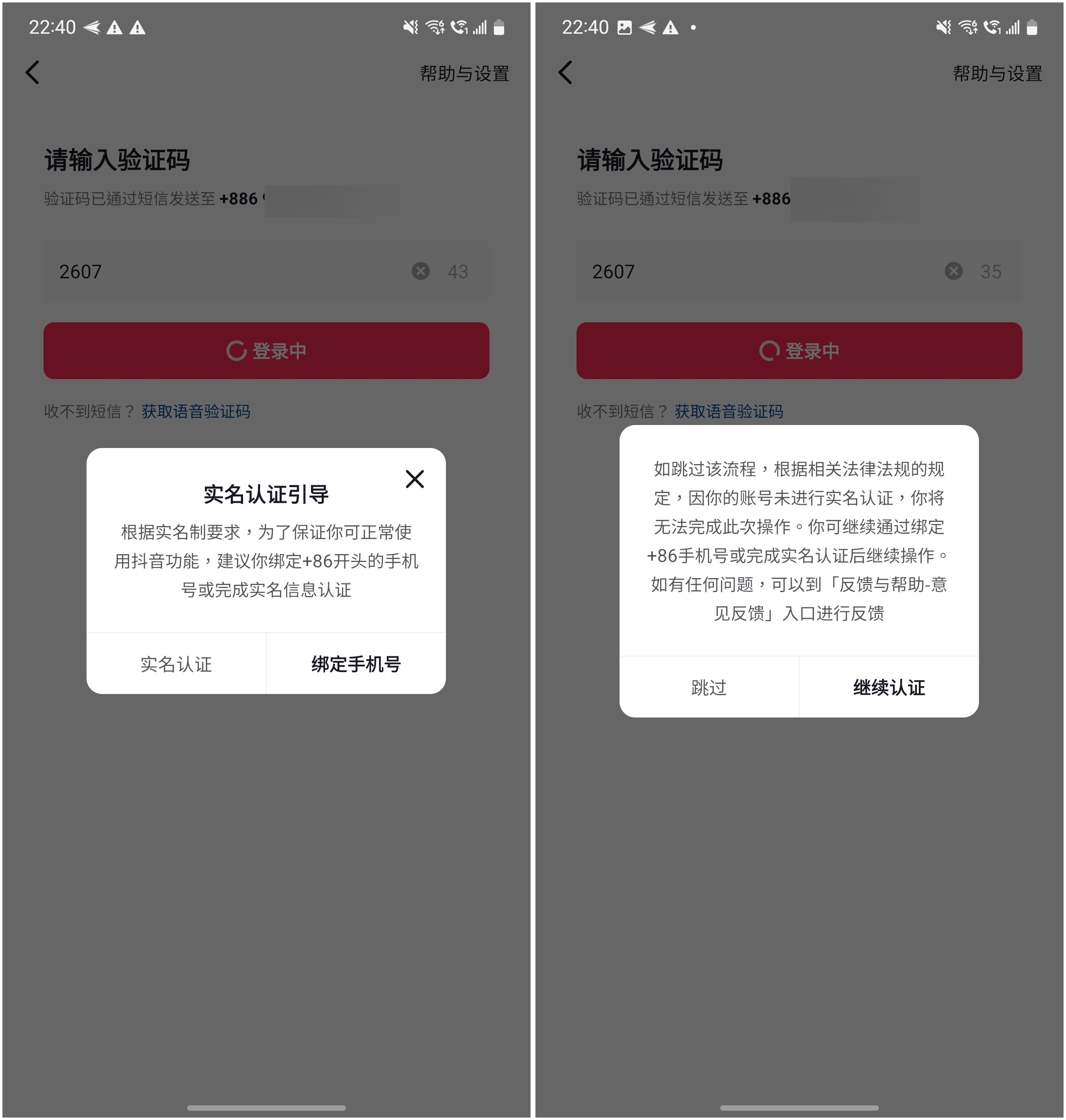 成功收到驗證碼進到這關時會出現實名認證,這部份不太需要管,反正抖音帳號只是用來登入剪映用,沒實名你還是能用帳號,可以按叉跟跳過。
