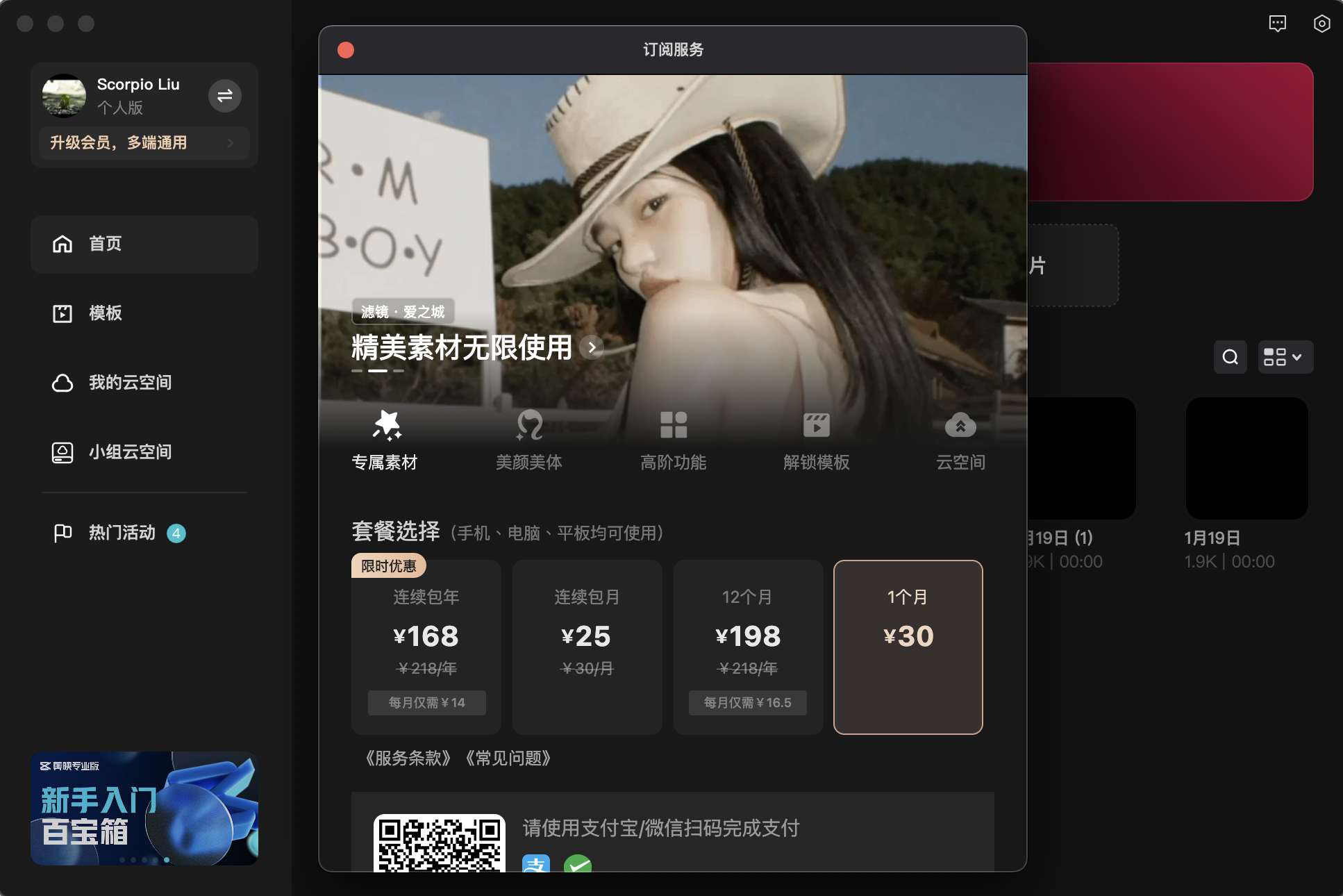 成功登入後你就可以使用各種 VIP 的特效、濾鏡進行剪輯,但如果你想要導出影片就需要付費,付費方式有二種,支付寶以及微信,這部份我會推薦大家用微信支付就好,可以直接綁自己的信用卡,以信用卡的方式進行支付,我實測是沒問題的。
