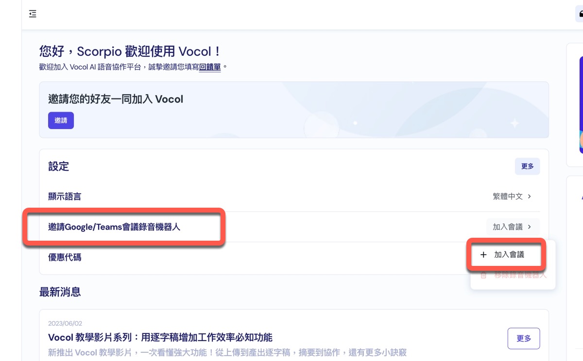 Vocol.ai 結合線上會議功能