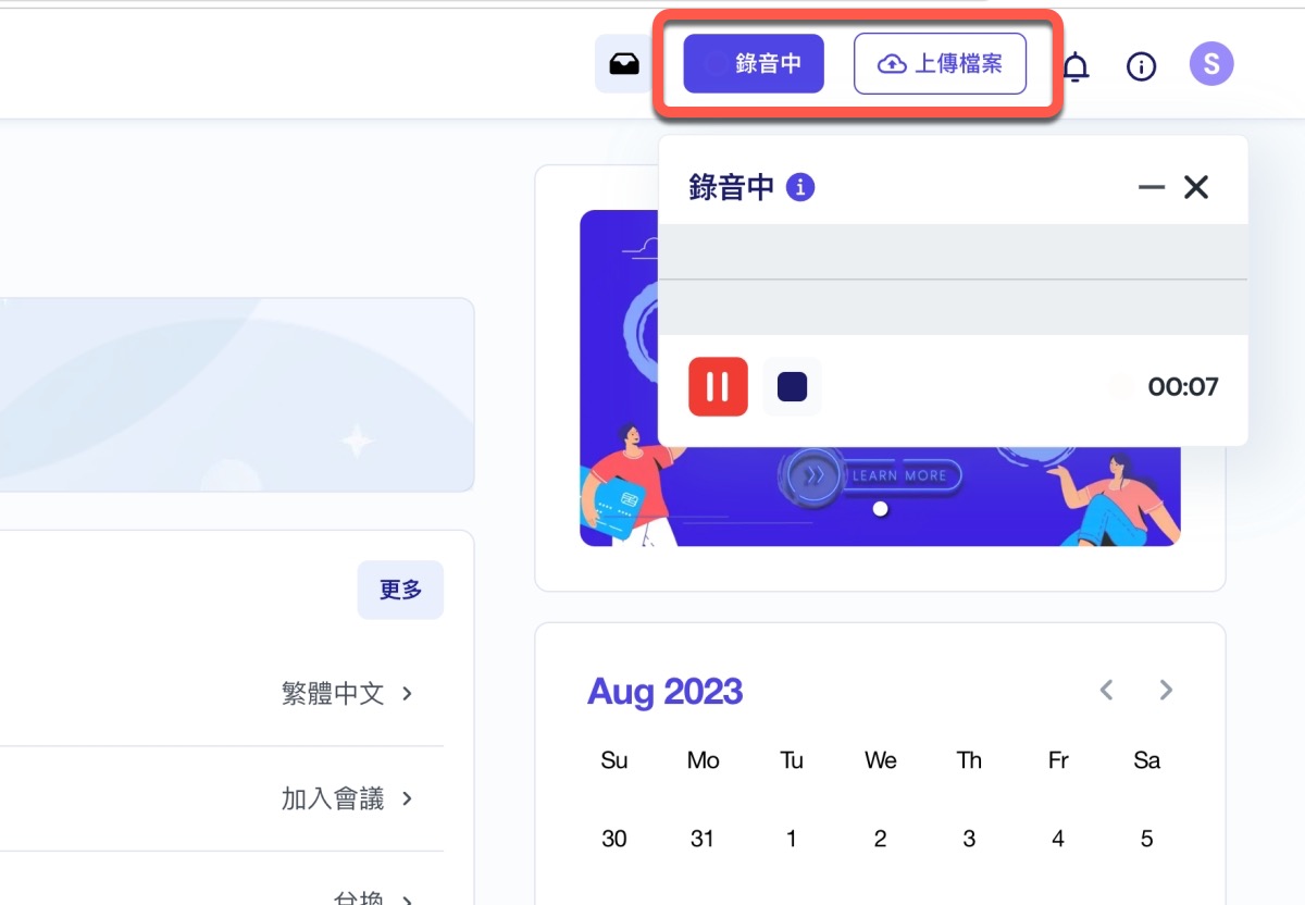 註冊後登入,這後台的介面也超級好上手,左側就是轉換過的媒體庫、方案,右上角可以直接即時錄音或上傳檔案,而中間是相關的設定及更多功能,所有的東西一目瞭然,接下來往下就來跟大家介紹這 Vocol.ai 究竟全部的功能有哪些,以及用起來又如何。