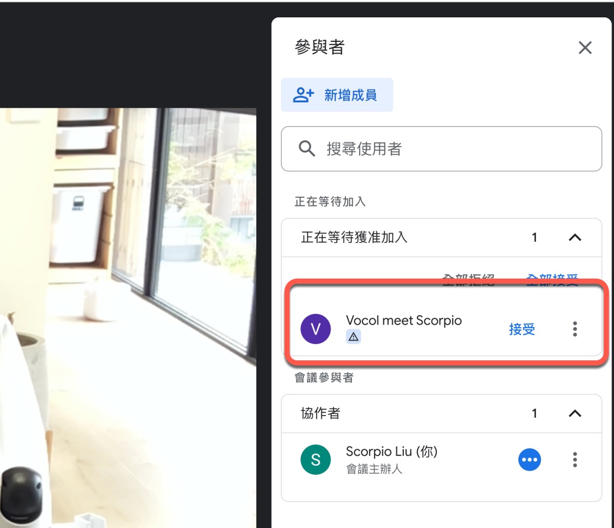 這時就可以在 Google Meet 裡看到 Vocol 要求加入會議,按接受就會變成與會者,在幕後默默的錄音記錄。