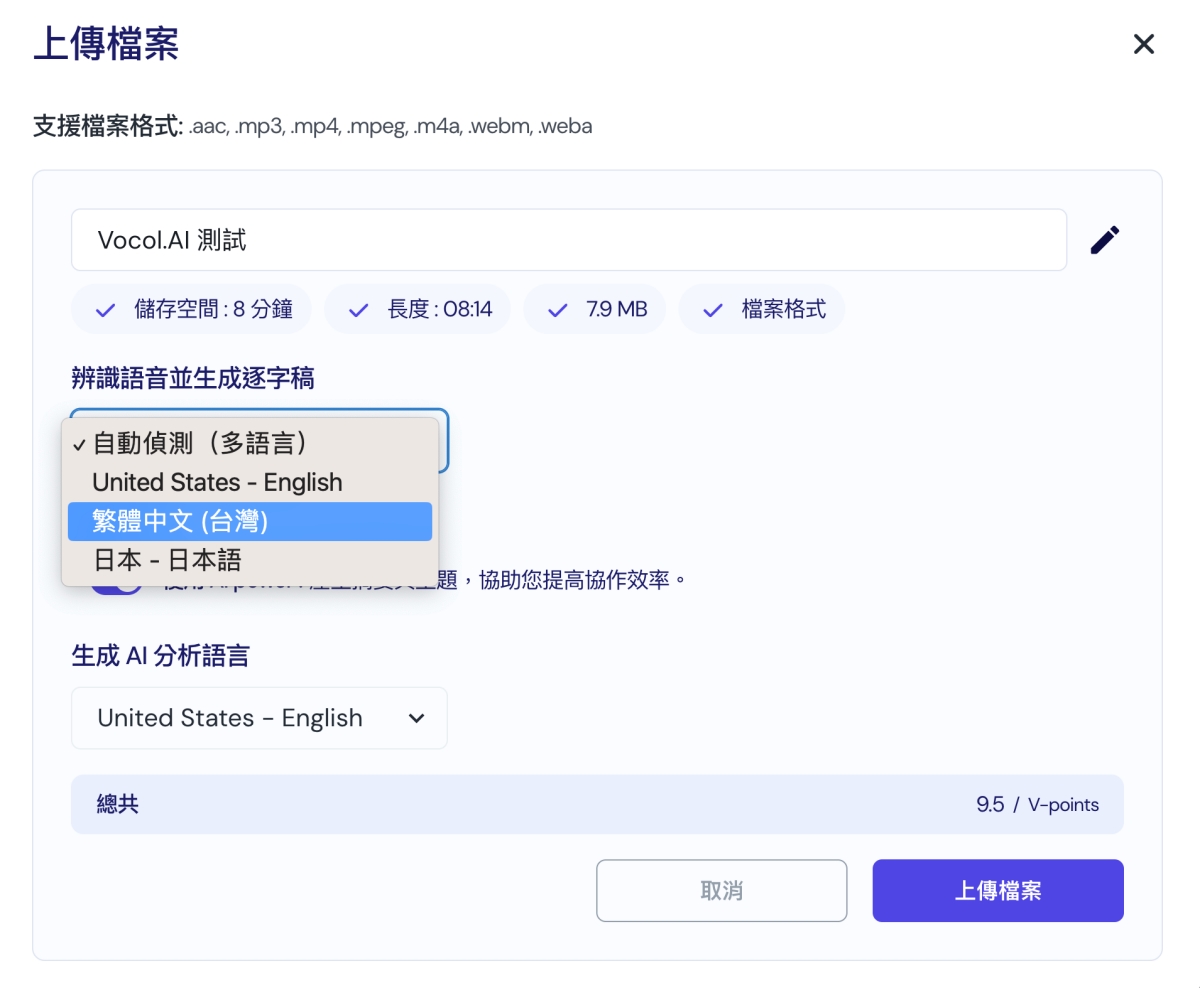 支援的上傳檔案包括:acc,mp3,mp4,mpeg,m4a,webm,weba,不論是常見的或是網路檔案格式都有支援,上傳後只要輸入標籤,選擇要偵測的語言等,就可以進行分析轉換。