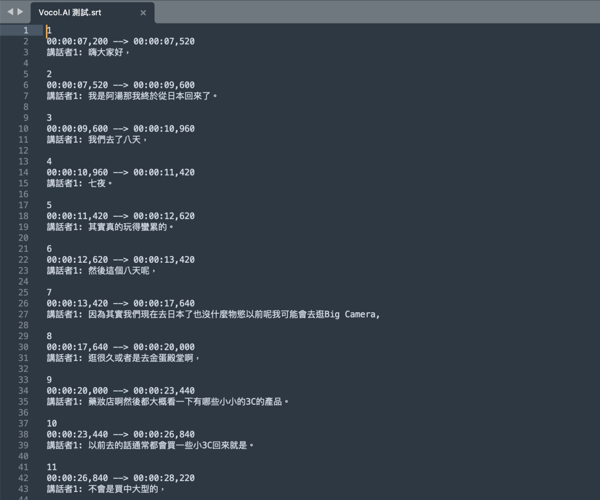 SRT 字幕檔的內容會長這様,這對影片創作者來說是很棒的一個工具,直接辨識時間軸切分好,只要稍做調整就可以使用。