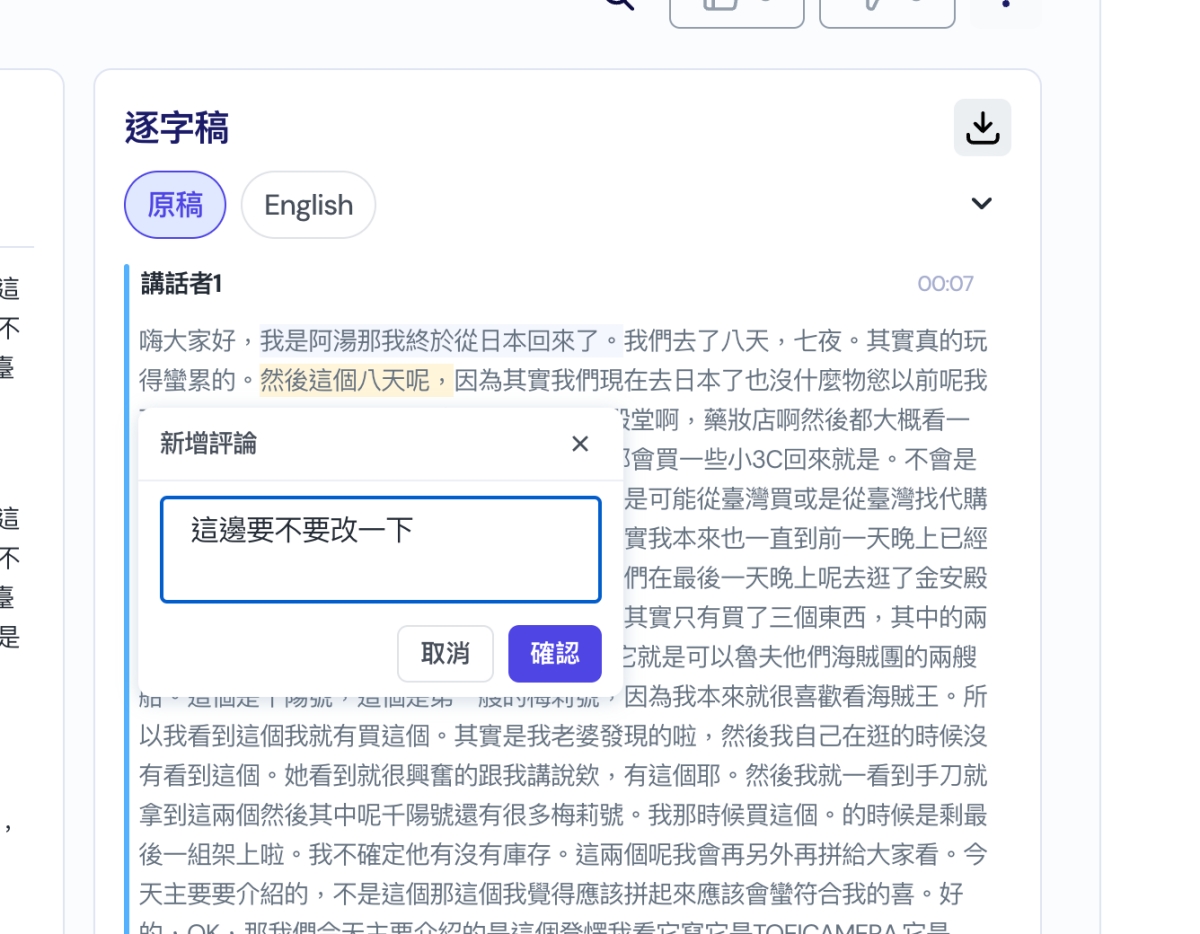 只有主擁有者可以再編輯逐字稿,選擇句子後,會出現評論跟編輯二個功能可以選擇。