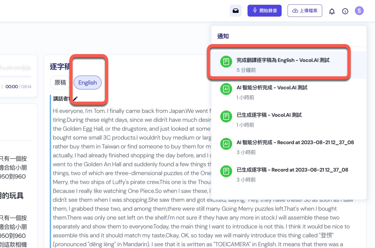 當完成分析時,基本上逐字稿也會在同一時間生成,會在頁面右上角的通知跳出來。