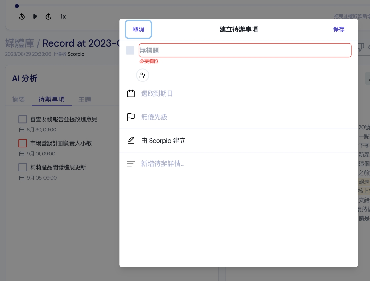 如果沒有分析到,或者該會議你臨時有其它待辦事項想加入,也可以自行建立,這也是沒有問題的哦。
