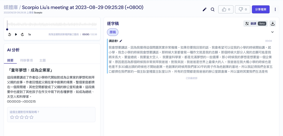 經過 Vocol.ai 的分析後,會將語音的全部內容轉出為二個部份,在媒體庫裡可以查看,左邊主要是 AI 分析,針對你的內容幫你做重點重摘要,並且條列內容整理,我試了各種不同長度的內容後,發現這摘要的重點整理其實蠻準確的,大致上看完摘要就可以了解內容是什麼。